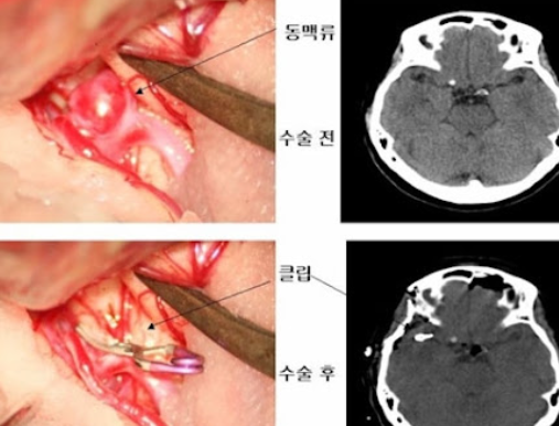 - 머리뼈를 열고 동맥류의 목 부분을 금속 클립으로 집어 혈류가 들어가지 못하게 막는 방법입니다.