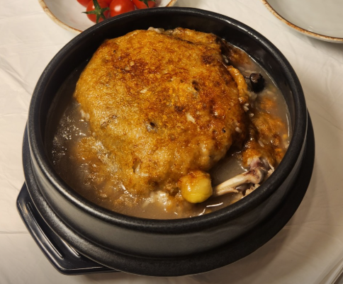 일반 삼계탕과 달리, 바삭하게 눌린 누룽지가 함께 들어가 있어 국물에 깊은 고소함이 더해지는 것이 특징입니다.
